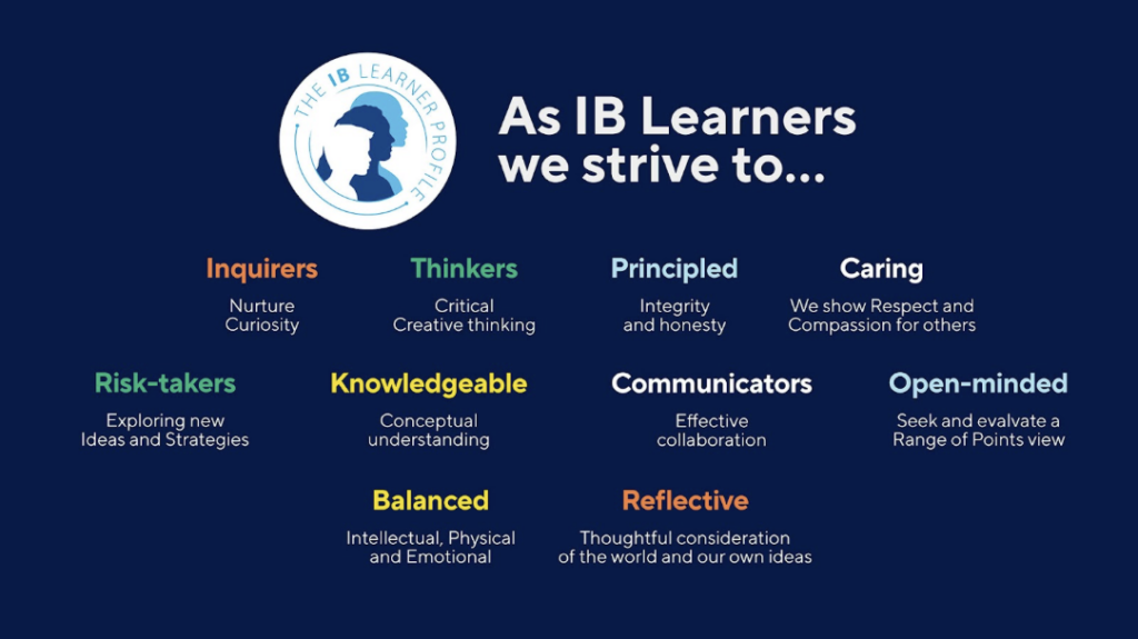 Amb aquest objectiu mentre es cursa el Programa del Diploma, es busca que l’alumne es formi en uns valors específics que l’IB té molt en compte. Així doncs, un alumne IB hauria de ser: Indagador, Informat i instruït, Pensador, Bon comunicador, Íntegre, De mentalitat oberta, Solidari, Audaç, Equilibrat, i Reflexiu.